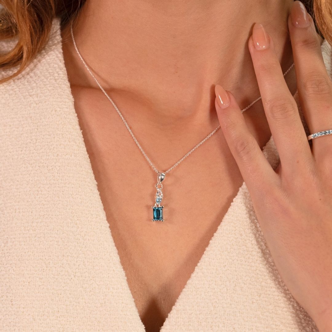 Inspired by the dazzling colours of the deep blue, this pendant features a striking baguette-cut blue topaz stone, adorned with dainty topaz stones above it. This sparkling gradient of serene colours has been inspired by the dynamic and ever-changing hues of the Cornish sea. Includes finest Italian made sterling silver extender chain with a 100% recyclable, plastic-free branded gift box.