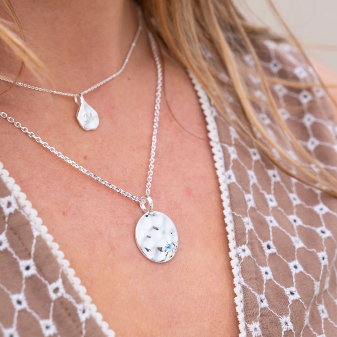 Handmade using sterling silver, this unique pendant is perfect for everyday wear and features a sparkling blue topaz nestled in a lightly textured, shiny surface inspired by the light ripples of the ocean on a calm day. Includes finest Italian made sterling silver extender chain and 100% recyclable, plastic-free branded gift box.