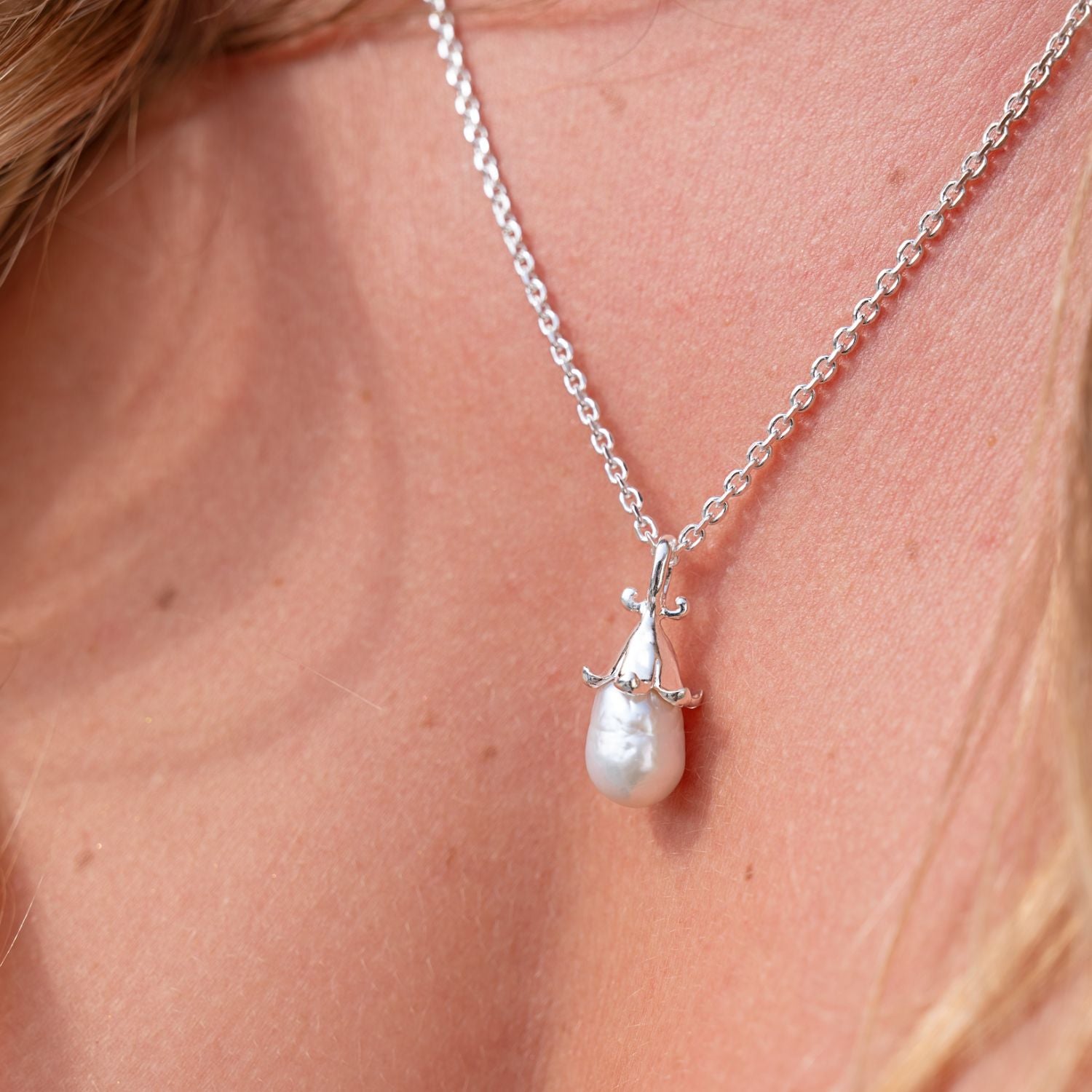Inspired by the wild bluebells in Cornwall, this pendant features the intricate bluebell flower with an eye-catching shimmering freshwater pearl beneath it. Includes finest Italian made sterling silver extender chain and 100% recyclable, plastic-free branded gift box.