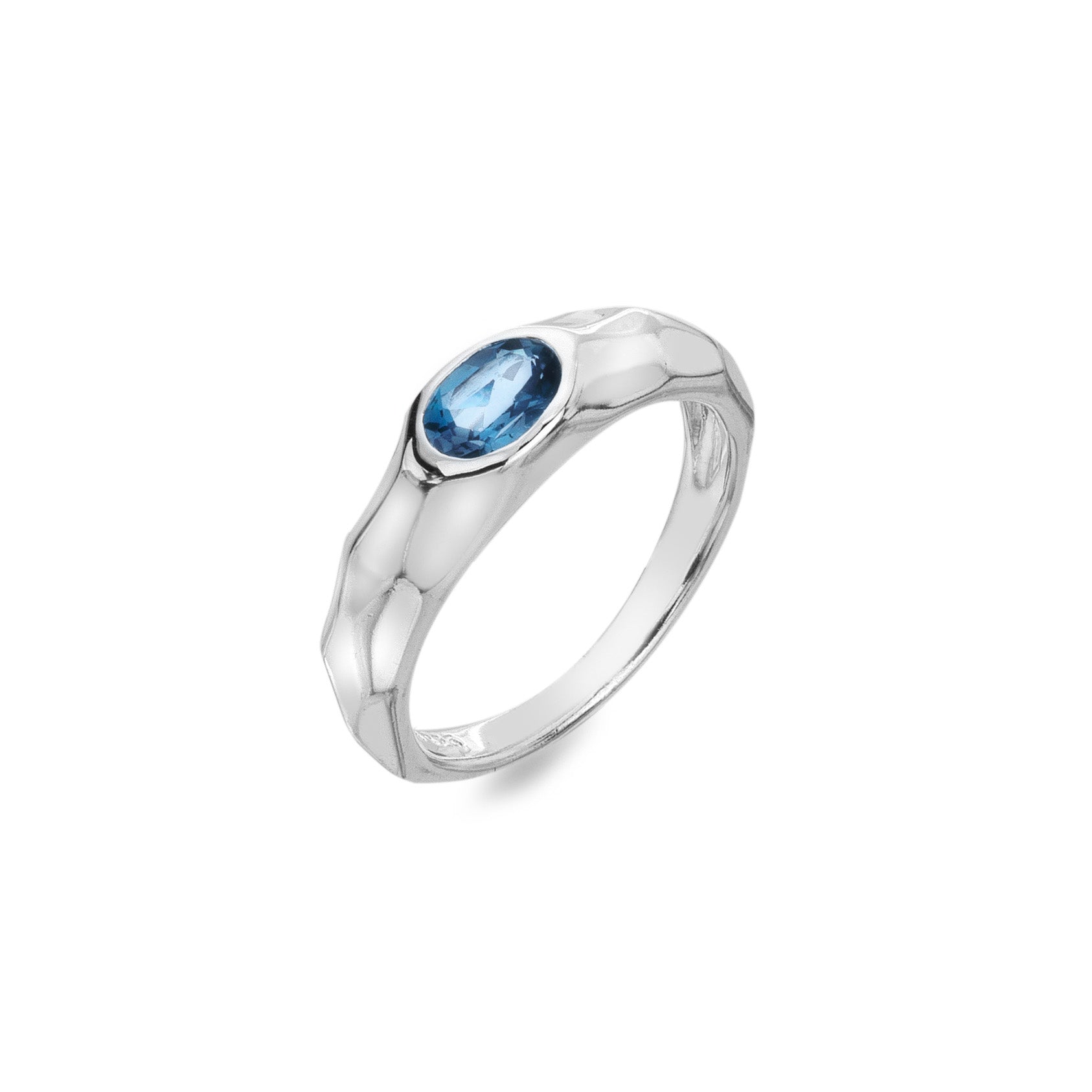 Inspired by the secret coves, naturally formed around Cornwall, this chunky Cove Ring features a deep London Blue Topaz stone in the centre. The sterling silver ring band is lightly hammered and gently catches the light with each movement. Elegant and stylish, this ring elevates any outfit and makes a beautiful gift for someone special.