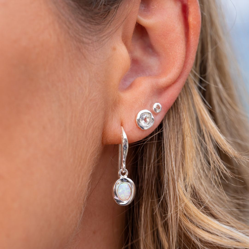 Handmade using sterling silver, these petite earrings feature dainty opalite stones surrounded by organic textured sterling silver setting. Can be worn with matching items. Includes 100% recyclable, plastic-free branded gift box.
