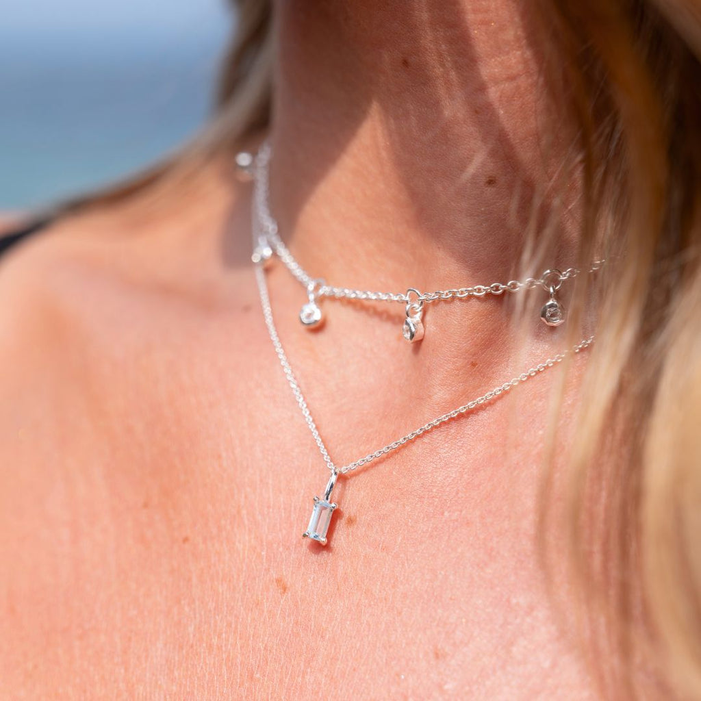 Handcrafted sterling silver pendant, showcasing a luxurious Aquamarine gemstone offering a subtle touch of colour to any look. Delicate yet distinctive, this pendant can be paired with our matching aquamarine studs. Includes finest Italian made sterling silver extender chain and 100% recyclable, plastic-free branded gift box.