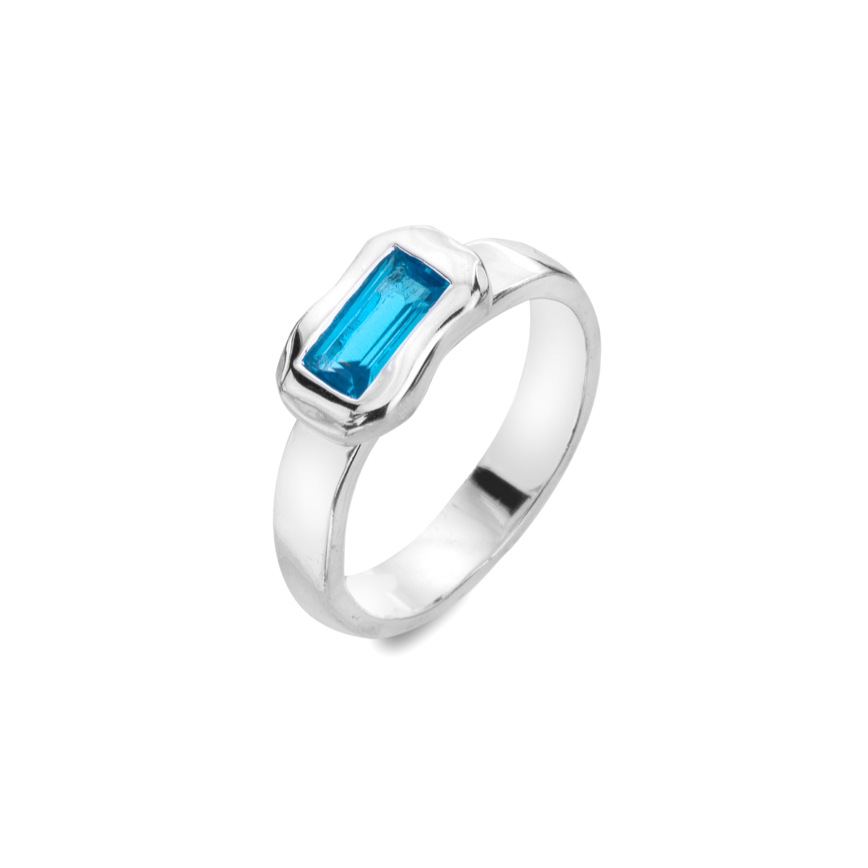 Inspired by the lost city of Atlantis, submerged in the depths of the ocean, this exquisite ring is part of our Atlantis Collection. Handcrafted in sterling silver, it features a bright Swiss blue topaz that sparkles in the sun and a wide organically shaped band with a high-shine finish. Can be worn with the matching items. Includes a 100% recyclable, plastic-free branded gift box.