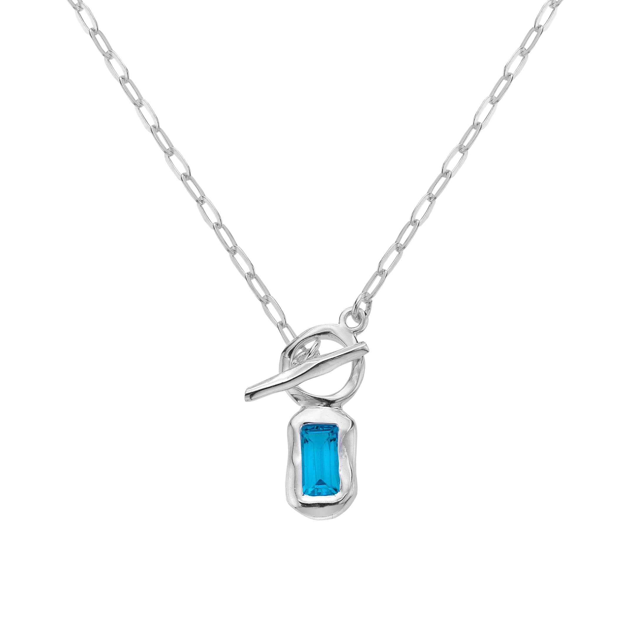 Inspired by the lost city of Atlantis, submerged in the depths of the ocean, this exquisite necklace is part of our Atlantis Collection. Handcrafted in sterling silver, it features a bright Swiss blue topaz that mirrors the sparkle of sunlit waves, completed with an elegant T-bar fastening for a modern, effortless finish. Can be worn with the matching items. Includes 100% recyclable, plastic-free branded gift box.