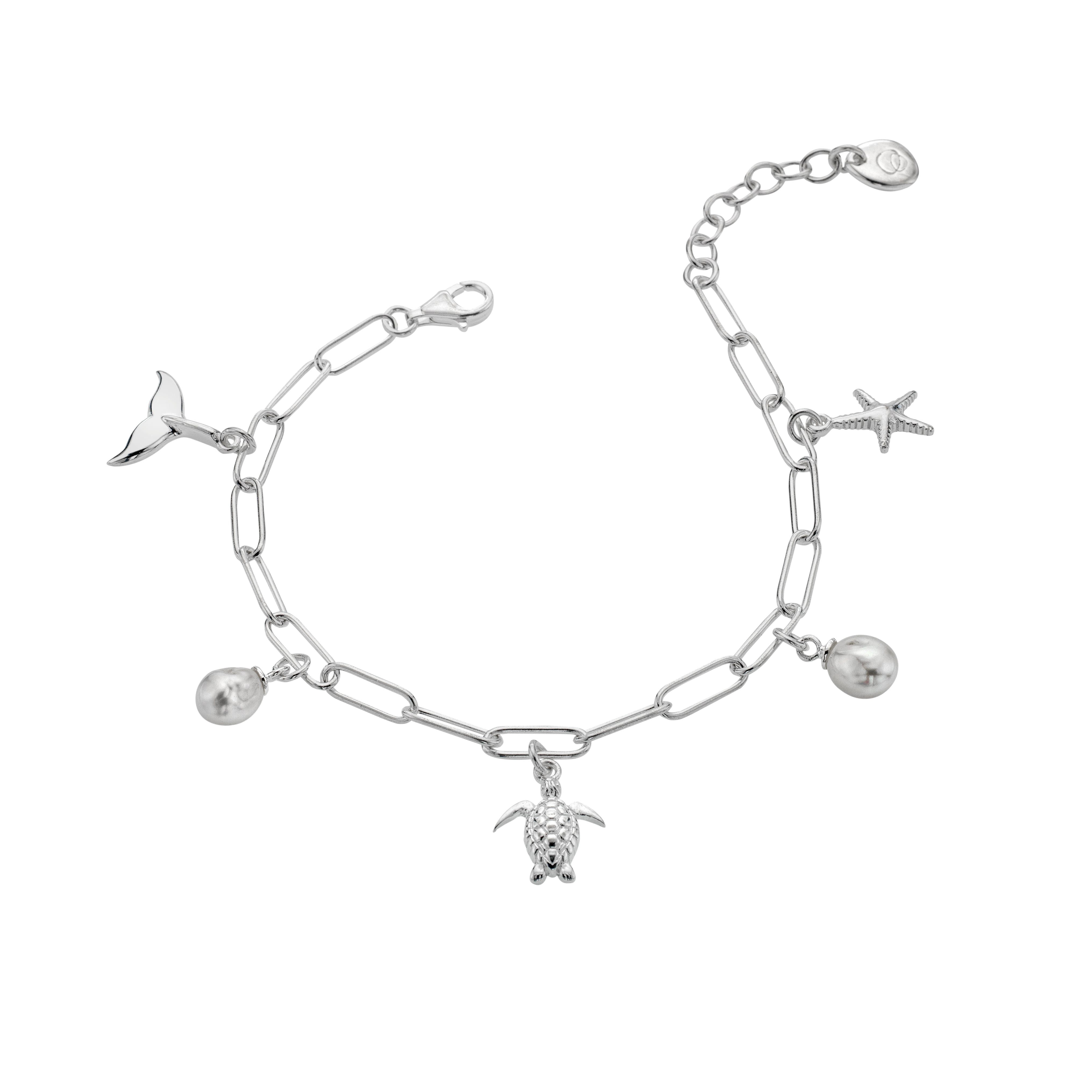 Inspired by the treasures of the ocean, this sterling silver bracelet is combines sea-life charms with shimmering baroque pearls on a stylish and contemporary paperclip extender chain. Lightweight and comfortable to wear, this bracelet makes a beautiful gift for those who love dolphins, whales, turtles and starfish. Includes luxury branded box.