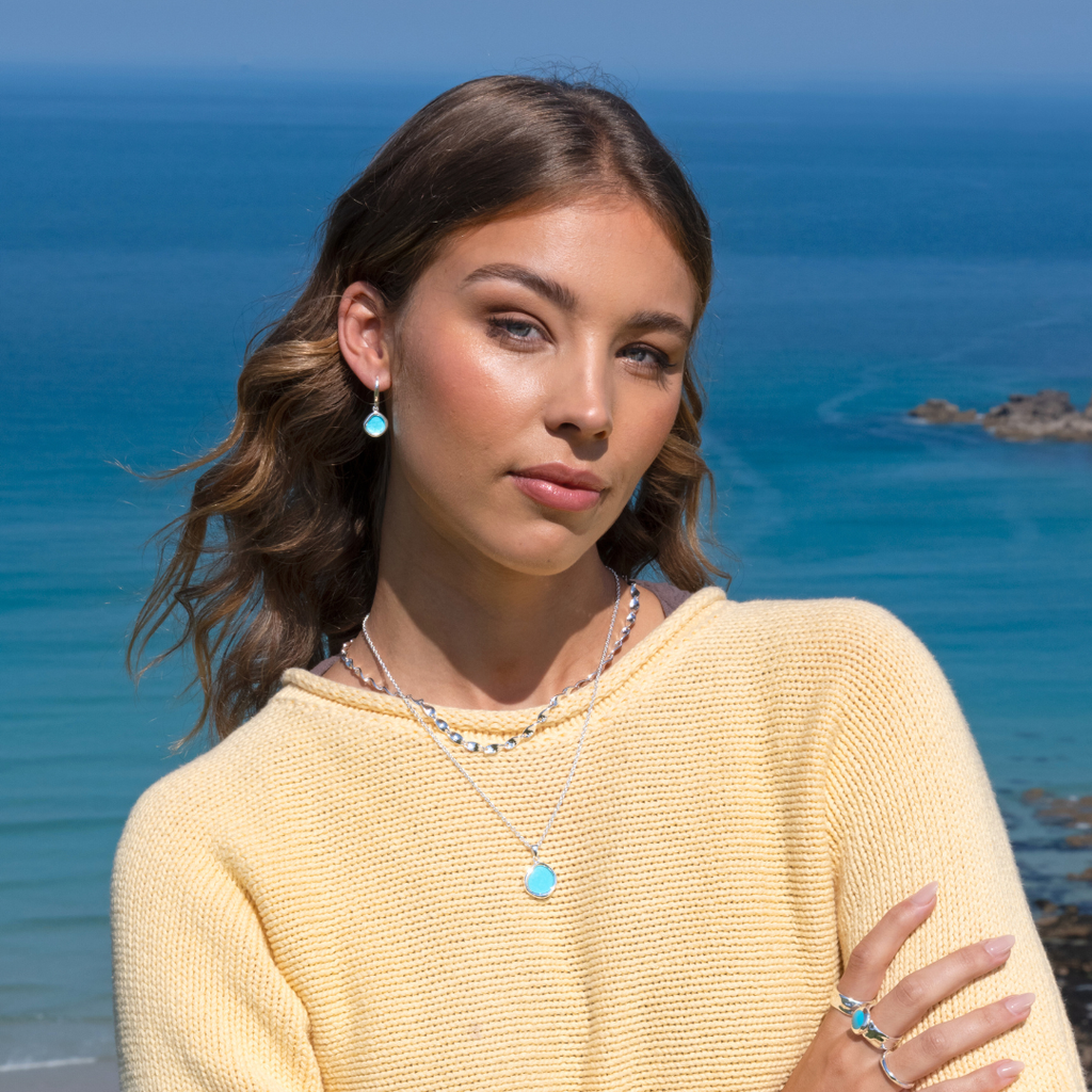 A handcrafted pendant featuring an organically shaped turquoise stone, beautifully encased in sterling silver. Inspired by the serene natural tide pools around the Cornish coast. Each pendant is one of a kind, with natural turquoise marbling patterns that make every piece unique. Can be worn with matching items. Includes finest Italian made sterling silver extender chain and 100% recyclable, plastic-free branded gift box.